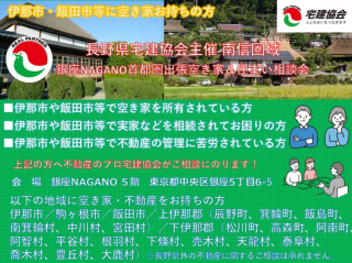 2025年11月12日開催 伊那市 駒ヶ根市 辰野町 箕輪町 飯島町 南箕輪村 中川村 宮田村 飯田市 松川町 高森町 阿南町 阿智村 平谷村 根羽村 下條村 売木村 天龍村 泰阜村 喬木村 豊丘村 大鹿村【R7.11/12 (水)】長野県宅建協会主催「南信圏域出張空き家&住まい相談会」@銀座NAGANO -