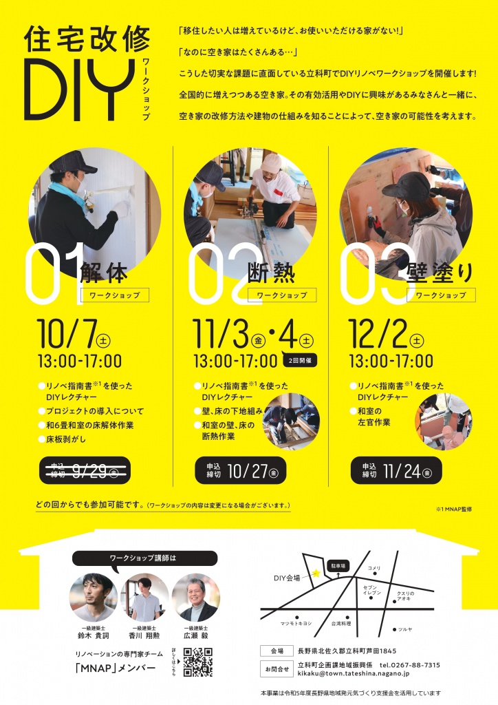 「移住したい人は増えているのに住む家がない」「空き家をどうしたらいいか分からない」という課題に直面する立科町では、昨年に引き続き実際の住宅を改修するDIYワークショップを開催します。