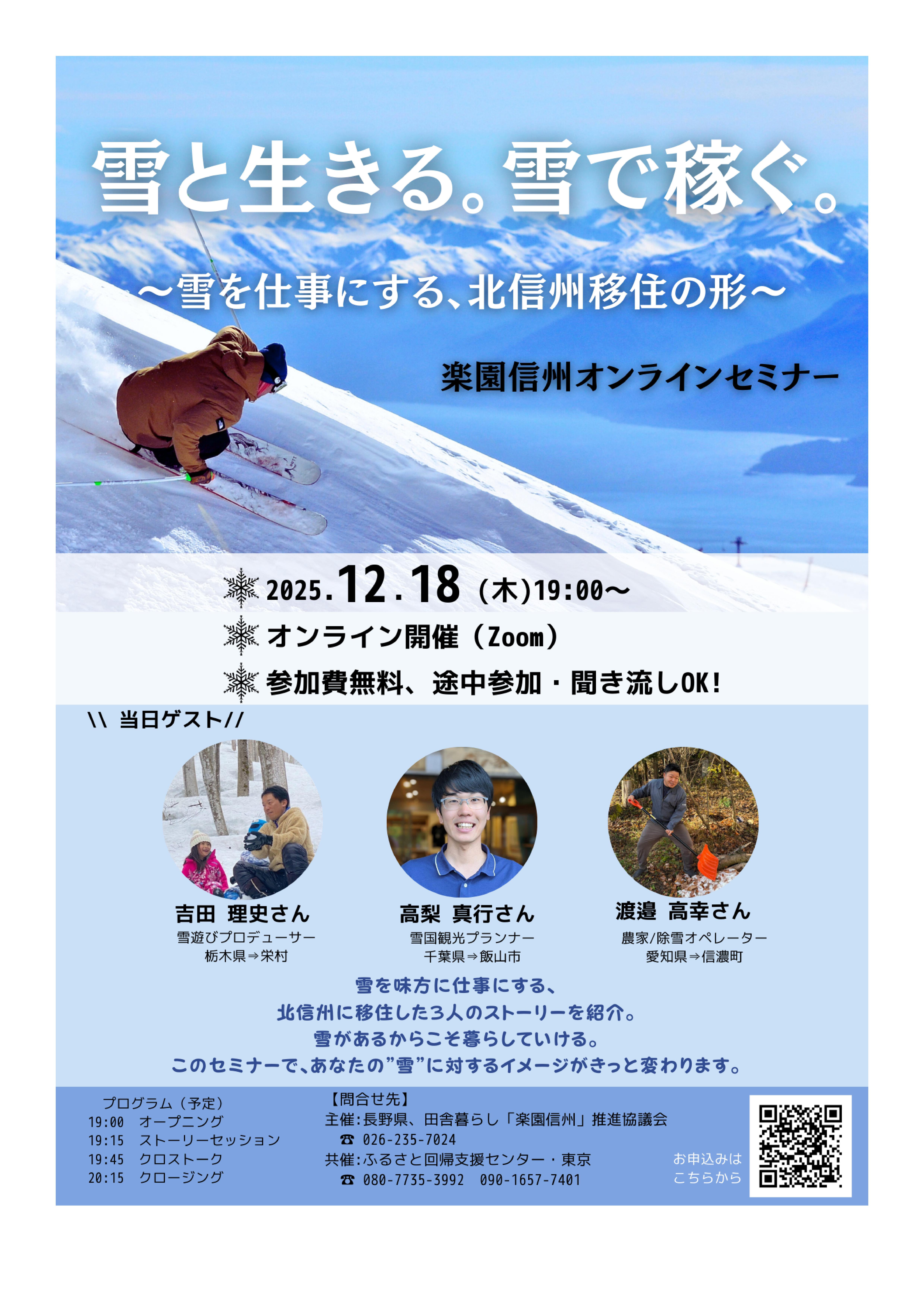 | 問合せ先 | ▼長野県信州暮らし推進センター(田舎暮らし「楽園信州」推進協議会) TEL:026-235-7024 Email:iju@pref.nagano.lg.jp ▼信州暮らしサポートデスク (一般社団法人 ふるさと回帰支援センター・東京内) TEL:090-1657-7401 080-7735-3992 (10~18時) Email:nagano@furusatokaiki.net 毎週月曜・祝日休館 |