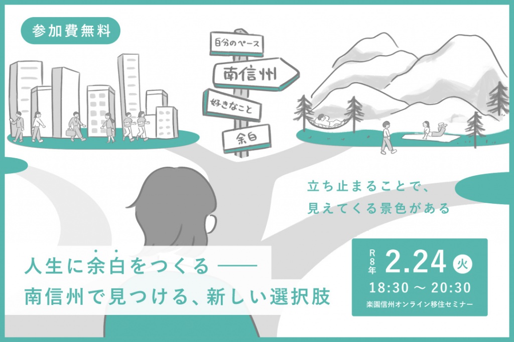 | 開催について | 【信州30分クッキング♪ ―地元の食卓から伝える、農ある暮らしと移住のヒント―】 開催日:令和8年(2026年)2月21日(土) 場 所:オンライン(ウェビナー) 時 間:13:00~13:45 【人生に余白を作る―南信州で見つける、新しい選択肢】 開催日:令和8年(2026年)2月24日(火) 場 所:オンライン(ウェビナー) 時 間:18:30~20:30 【本好き集まれ! 信州で叶える『本』が中心にある暮らし】 開催日:令和8年(2026年)2月26日(木) 場 所:オンライン(ウェビナー) 時 間:19:00~20:30 【信州で暮らす働くフェア・ミニ】 開催日:令和8年(2026年)2月28日(土) 場 所:東京交通会館12階 カトレアサロンA(東京都千代田区有楽町2-10-1) 時 間:11:00~17:00 参加費:無料 |