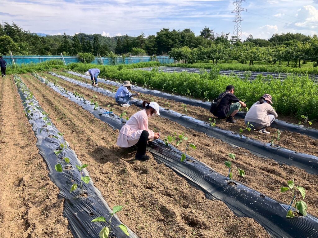 ツアーでは、松川町役場担当者による町内案内からスタートして、3軒の農家さんを訪ねました。最初に訪ねたのは移住者でもある「小人農園」の矢野悟さん。「料理人だったときに食べた有機栽培のニンジンの美味しさに衝撃を受けて農家に転向しました。」という矢野さんから、移住当初のお話や野菜づくりにかける思いを語っていただきました。その後みんなで畑におじゃまして、野菜の苗を支える支柱を立てる作業のお手伝いをしました。