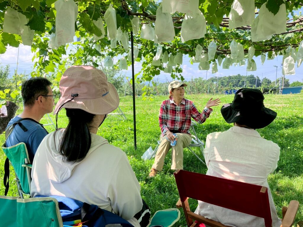 翌日は、先代からの果樹園を受け継いで、主にりんごを作っている「やまき北村農園」の北村朝子さんを訪ねました。くだものづくりの大変さややりがい、農家として大切にしている姿勢などのお話を伺いました。「くだものづくりは子育てに似ています。」というお話も。その後はりんごやぶどうの摘果のお手伝いをしました。