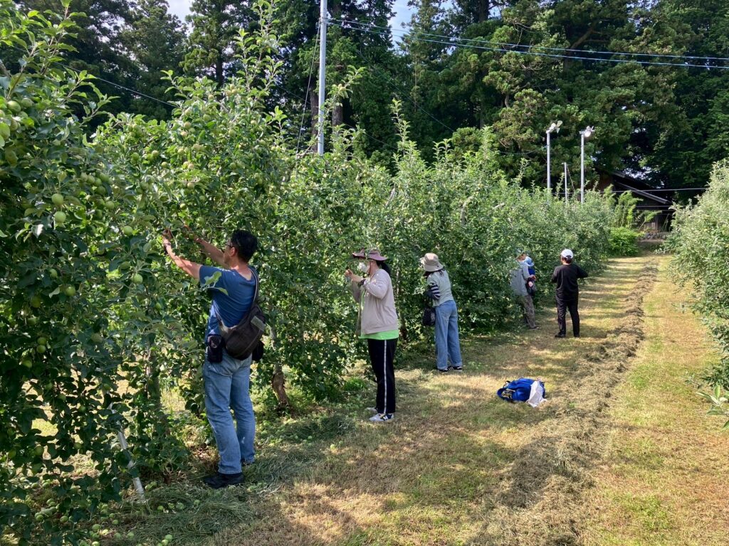 最後に、果樹研修生度を利用して2年前に松川町に移住し、主にりんごと梨を作っている「円谷ガーデンファーム」の円谷淳二さんを訪ねました。「農業の大変さを日に日に感じています。でも畑にいると心が落ち着くんですよね。」という円谷さん。農家になったいきさつや今の暮らしについてお話を伺った後、りんごの摘果作業のお手伝いにみんなで汗を流しました。